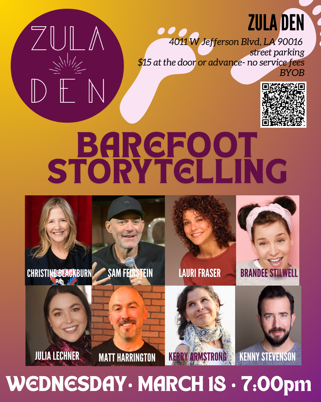 It’s at the ultra cool Zula Den! Take off your shoes and join us Wednesday March 18th at 7pm. Free street parking, BYOB, no service fees and only the BEST storytellers in LA!